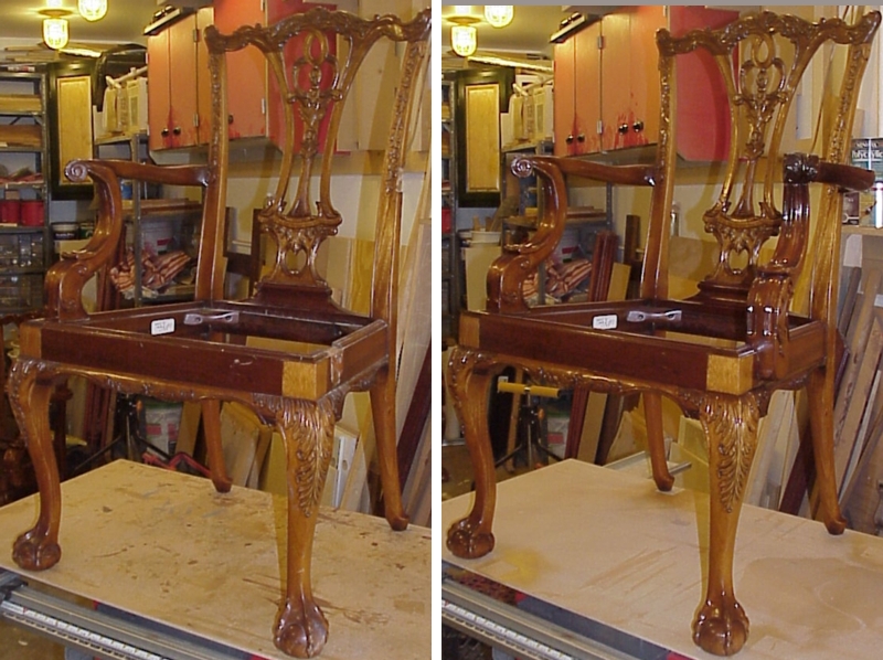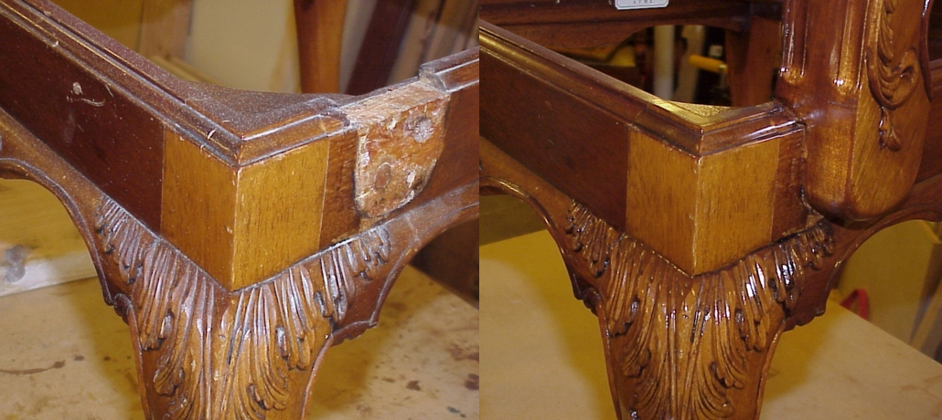and had failed in many areas. The sets of before and after pictures shown below reveal some of the restoration work that was necessary to bring the chairs back to their original beauty. |