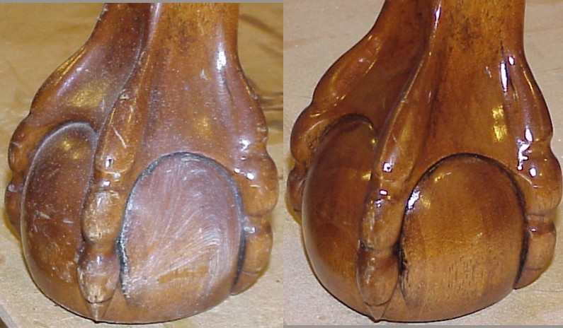 A close up of one of the claw feet reveals the state of degradation of the original fnish. The end result of careful cleaning and restoration of the lacquer finish returned the lost beauty and luster of the handcarved claw foot. |